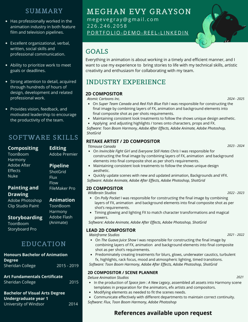 I’ve worked as a 2D Compositing Artist in both Harmony and After Effects, as well as a Scene Setup Artist and Storyboarder.